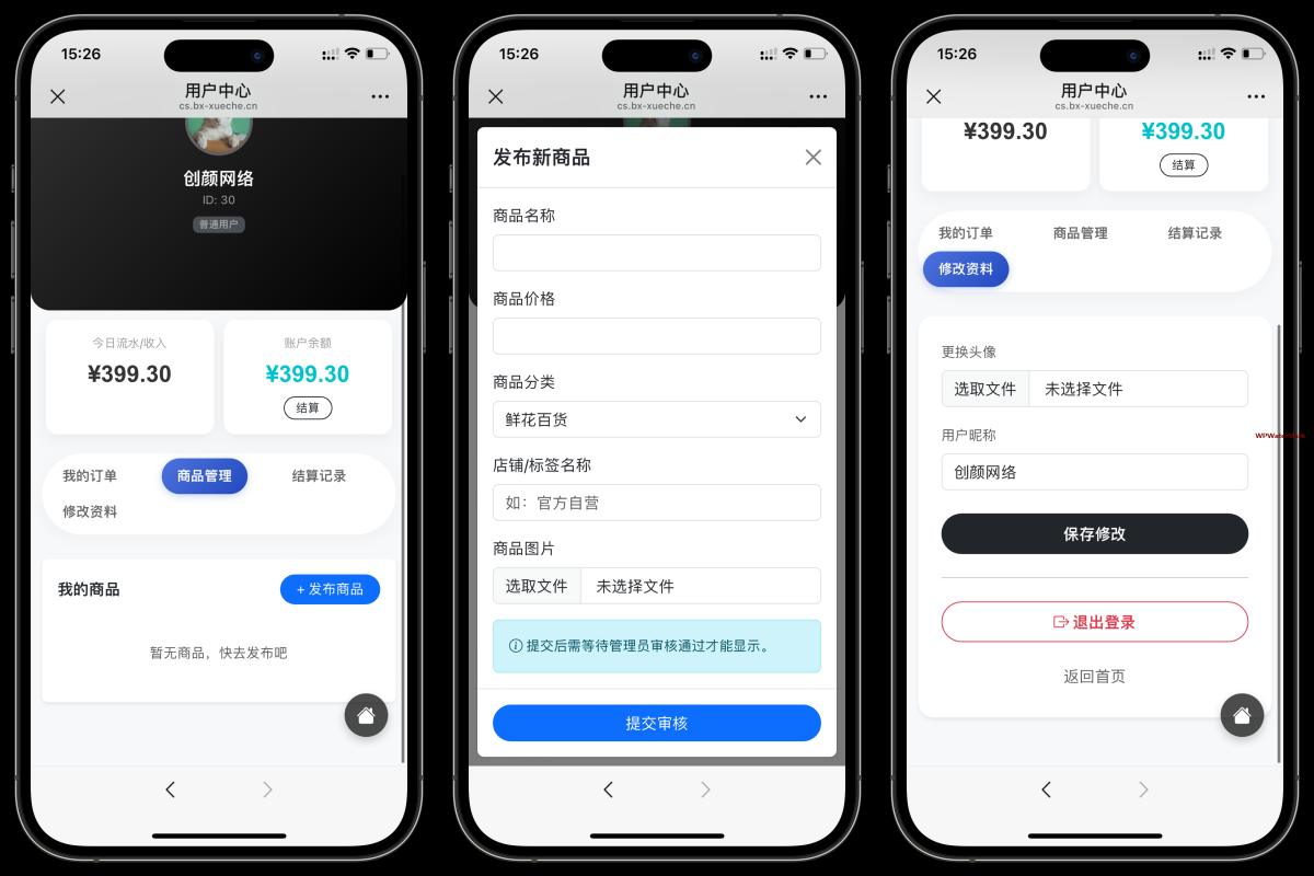5.用户可自行上架商品,后台审核通过之后前台显示