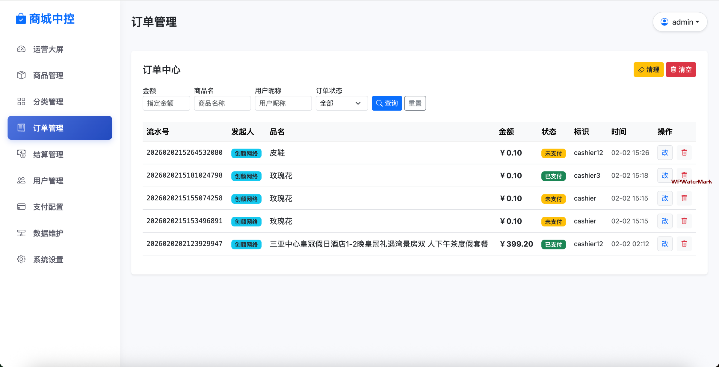 6.更新订单筛选功能,支持按金额、商品名字、用户昵称、支付状态查询,最多显示200条
