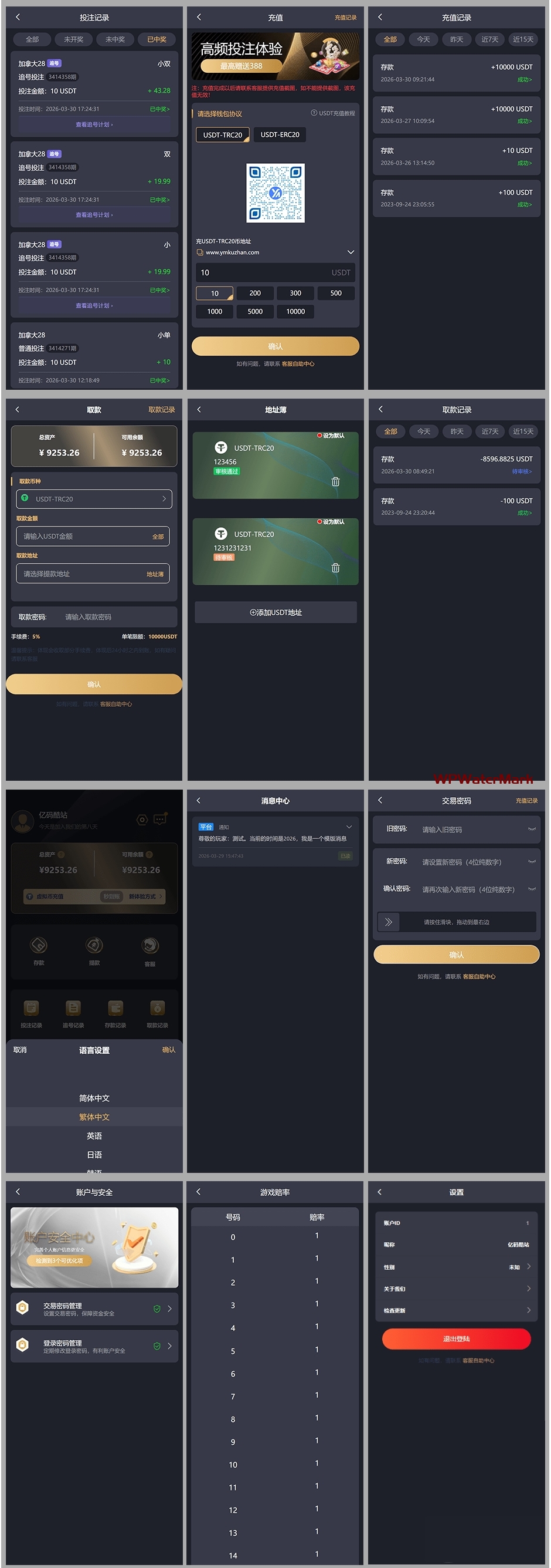 后台管理方面,系统提供用户管理、充值提现审核、赔率调整及投注/追号计划的日志监控等功能,具备基础平台运营能力。