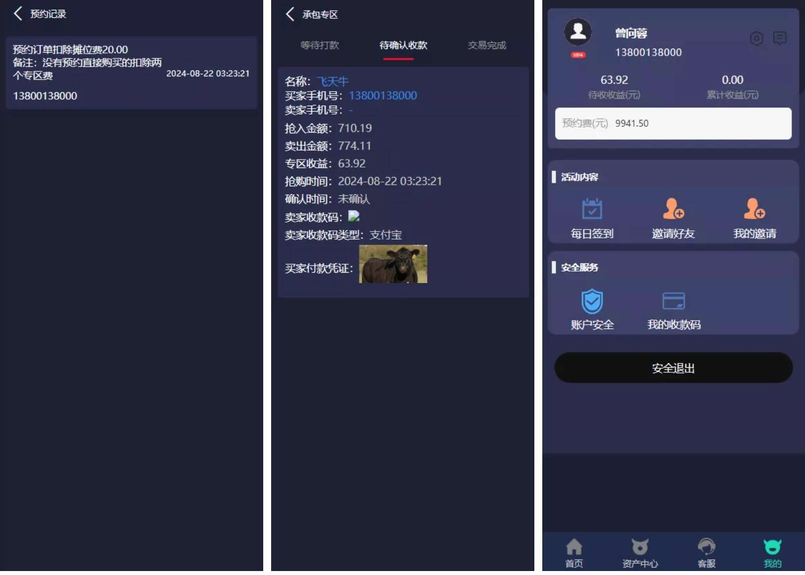 均是对方收益的10%,推荐奖满300即可对应️号专区卖出,半小时内打款赠送诚信值,