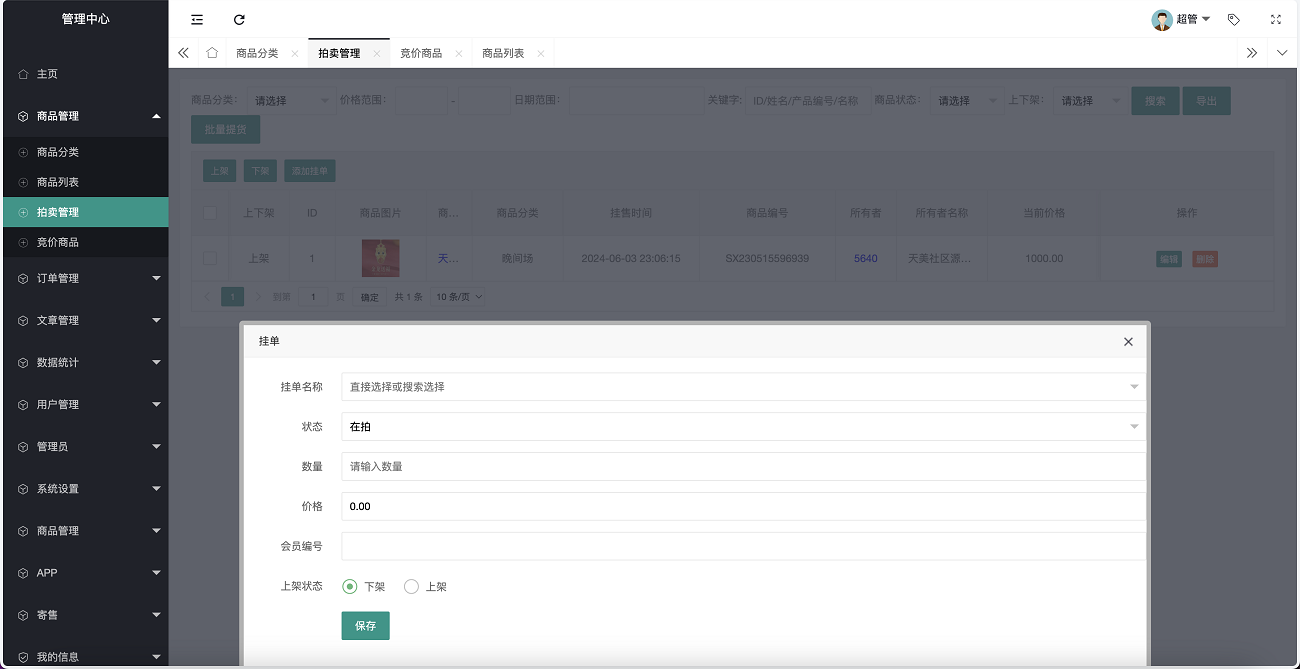 ①、后台可添加商品进行挂单