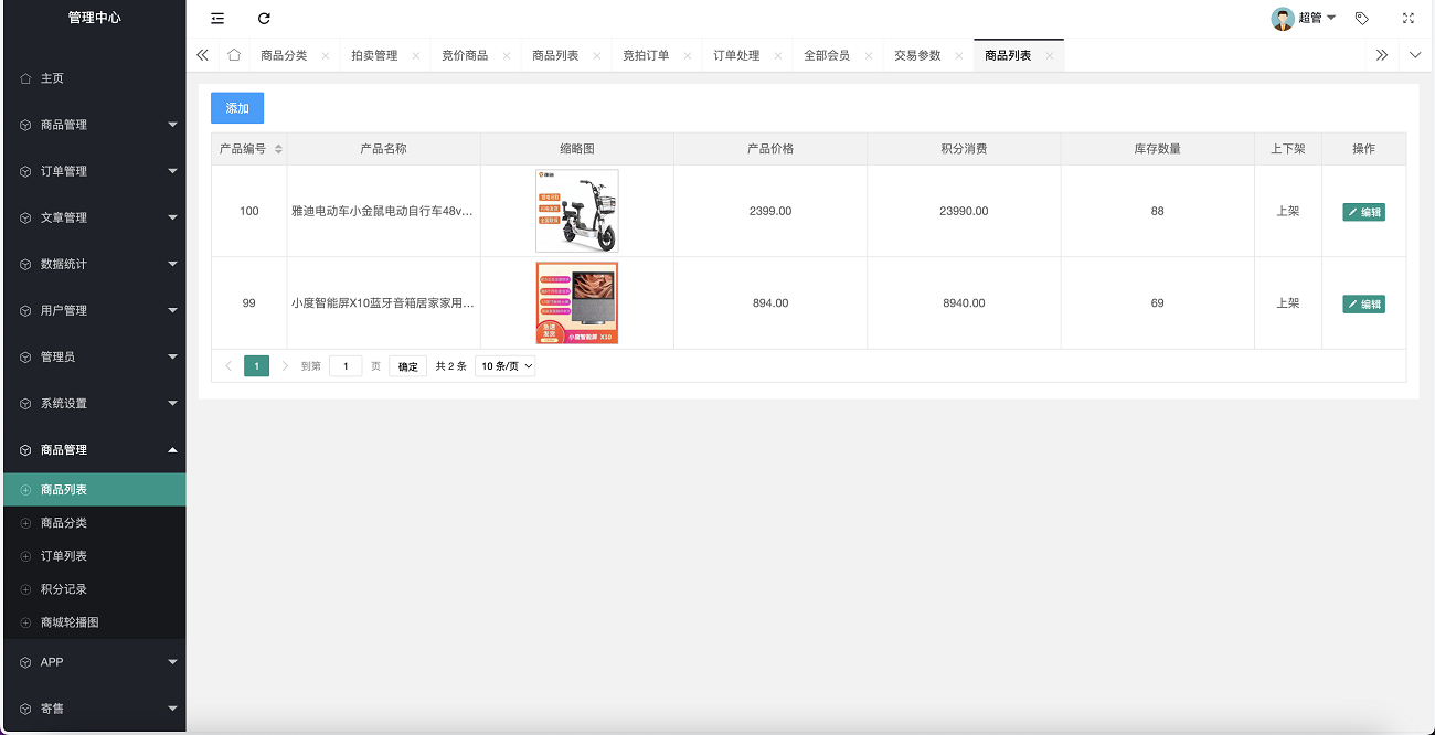 整套程序主要以拍卖挂售为主,然后就是积分商城,没有新奇的功能