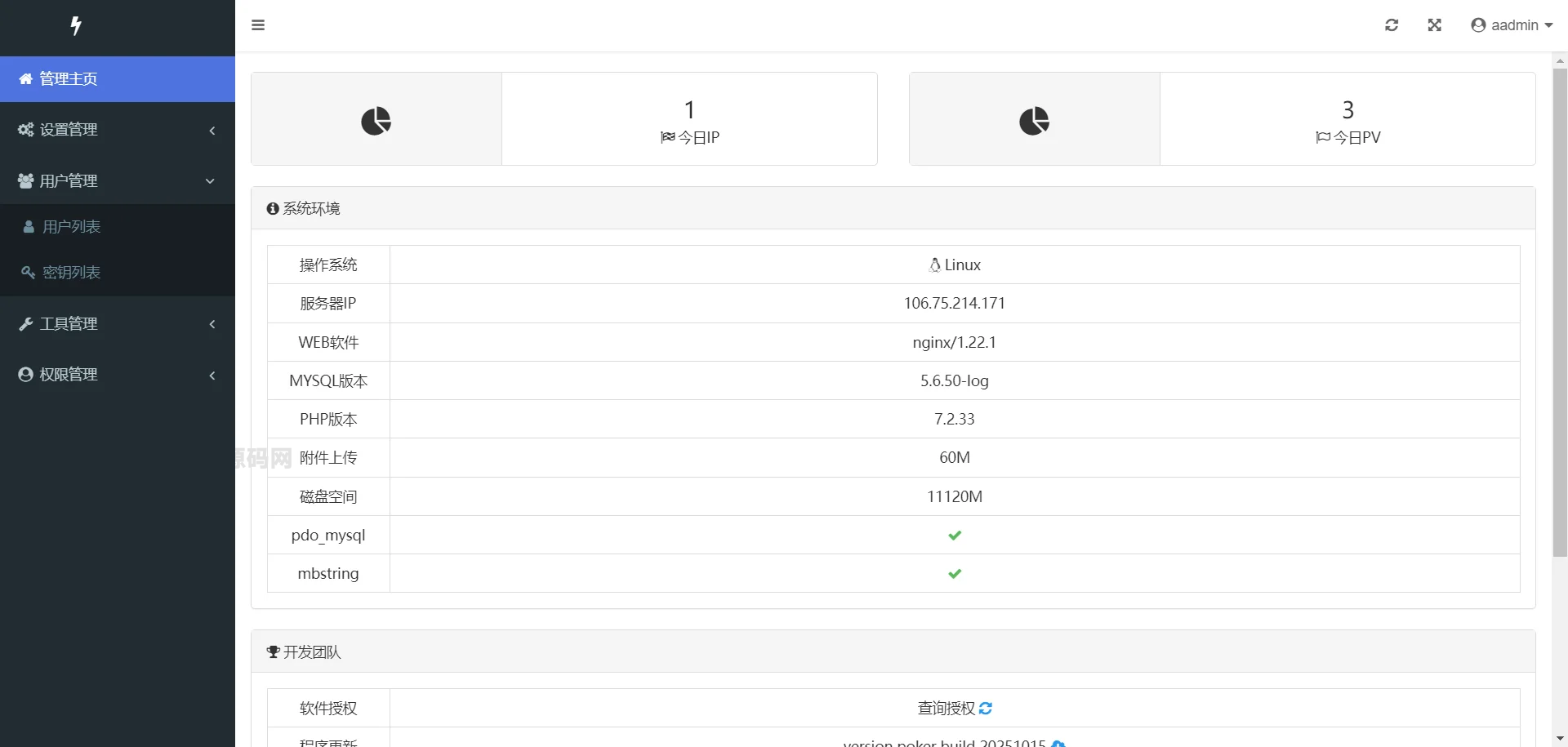 后台功能:ip访问统计、sql命令工具、升级模块、管理员模块、会员模块、卡密模块